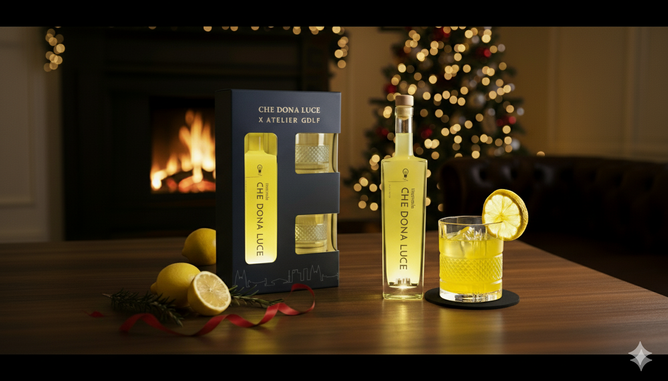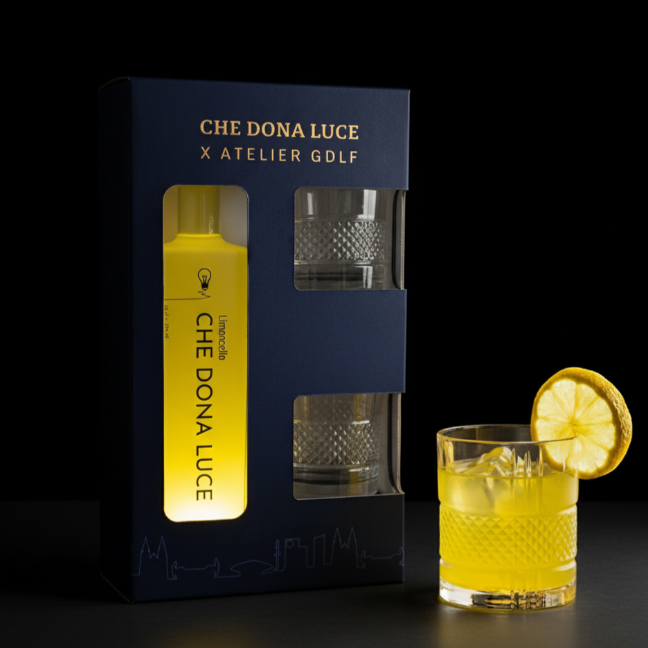 Elke set bevat een fles van de bekroonde Che Dona Luce limoncello ( beste limoncello ter wereld in 2023), gecombineerd met twee Italiaanse kristallen glazen van Atelier GDLF.
